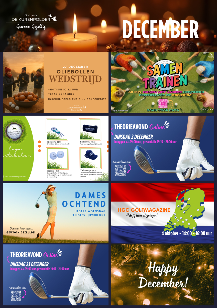 Binnen dit gedeelte van de website word je op de hoogte gehouden van events en andere belangrijke data op Golfpark De Kurenpolder. Zie ook de activiteiten in het menu links.Op De Kurenpolder worden activiteiten en wedstrijden georganiseerd door de Hollandsche Golfclub: voor iedereen, of je nu lid bent van onze club of niet. Heel soms zijn activiteiten alleen voor Golfstarters; dit zijn beginners uit ons opleidingstraject. Tijdens deze activiteiten leer je op een ongedwongen, gezellige manier het golfspel, in kleine groepjes met volledige aandacht van de pro.