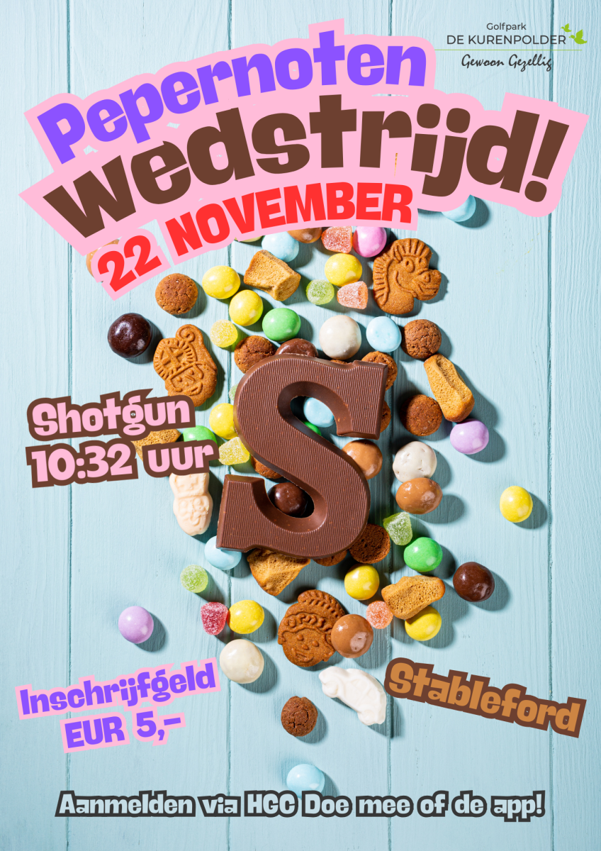 Op zaterdag 22 november  spelen we de PEPERNOOTWEDSTRIJD. We spelen 9 holes Stableford (shotgun) en we starten om 10:32 uur.